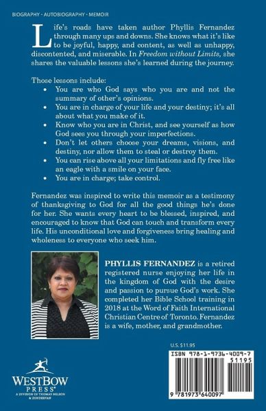 Life's roads have taken author Phyllis Fernandez through many ups and downs. She knows what it's like to be joyful, happy, and content, as well as unhappy, discontented, and miserable. In Freedom without Limits, she shares the valuable lessons she's learned during the journey. Those lessons include: You are who God says who you are and not the summary of other's opinions. You are in charge of your life and your destiny; it's all about what you make of it. Know who you are in Christ, and see yourself as how God sees you through your imperfections. Don't let others choose your dreams, visions, and destiny, nor allow them to steal or destroy them. You can rise above all your limitations and fly free like an eagle with a smile on your face. You are in charge; take control. Fernandez was inspired to write this memoir as a testimony of thanksgiving to God for all the good things he's done for her. She wants every heart to be blessed, inspired, and encouraged to know that God can touch and transform every life. His unconditional love and forgiveness bring healing and wholeness to everyone who seek him.