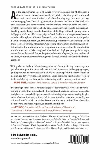 As the 2011 uprisings in North Africa reverberated across the Middle East, a diverse cross section of women and girls publicly disputed gender and sexual norms in novel, unauthorized, and often shocking ways. In a series of case studies ranging from Tunisia's 14 January Revolution to the Taksim Gezi Park protests in Istanbul, the contributors to Freedom without Permission reveal the centrality of the intersections between body, gender, sexuality, and space to these groundbreaking events. Essays include discussions of the blogs written by young women in Egypt, the Women2Drive campaign in Saudi Arabia, the reintegration of women into the public sphere in Yemen, the sexualization of female protesters encamped at Bahrain's Pearl Roundabout, and the embodied, performative, and artistic spaces of Morocco's 20 February Movement. Conceiving of revolution as affective, embodied, spatialized, and aesthetic forms of upheaval and transgression, the contributors show how women activists imagined, inhabited, and deployed new spatial arrangements that undermined the public-private divisions of spaces, bodies, and social relations, continuously transforming them through symbolic and embodied transgressions. Contributors. Lamia Benyoussef, Susanne Dahlgren, Karina Eileraas, Susana Galan, Banu Gökariksel, Frances S. Hasso, Sonali Pahwa, Zakia Salime