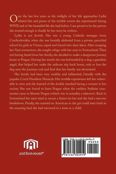 Over the last few years as the twilight of her life approaches Lydia related bits and pieces of the terrible events she experienced during WWII and of the beautiful life she had before. I am proud to be the person she trusted enough to finally let her story be written. Lydia is not Jewish. She was a young Catholic teenager from Czechoslovakia, when she was brutally abducted from a private, parochial school for girls in Vienna, raped and forced into slave labor. After escaping her Nazi tormentors, she sought refuge with her aunt in Switzerland. Then not having heard from her family, she decided to make a dangerous journey home to Prague. During her travels she was befriended by a dog, a guardian angel, that helped her make the arduous trip back home, only to lose the dog near the journeys end and find that her family was devastated. Her family had been very wealthy and influential, friendly with the popular Czech President Mazaryk. Her terrible experiences left her vulnerable to men and she learned of the double standard facing a woman in her society. She was forced to leave Prague when the ruthless Stalinist communist came to liberate Prague (which was in actuality a takeover). Back in Switzerland her aunt tried to secure a future for her and she had a nervous breakdown. Finally, she married an American so she get could start fresh in the amazing land she had traversed in a train as a child.