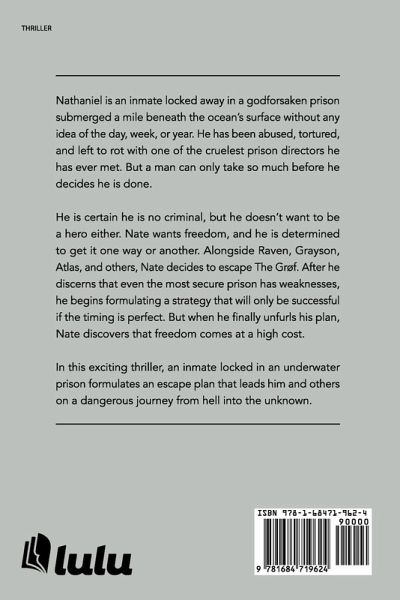 Nathaniel is an inmate locked away in a godforsaken prison submerged a mile beneath the ocean's surface without any idea of the day, week, or year. He has been abused, tortured, and left to rot with one of the cruelest prison directors he has ever met. But a man can only take so much before he decides he is done. He is certain he is no criminal, but he doesn't want to be a hero either. Nate wants freedom, and he is determined to get it one way or another. Alongside Raven, Grayson, Atlas, and others, Nate decides to escape The Grøf. After he discerns that even the most secure prison has weaknesses, he begins formulating a strategy that will only be successful if the timing is perfect. But when he finally unfurls his plan, Nate discovers that freedom comes at a high cost. In this exciting thriller, an inmate locked in an underwater prison formulates an escape plan that leads him and others on a dangerous journey from hell into the unknown.