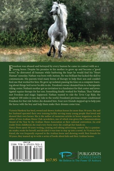 Freedom was abused and betrayed by every human he came in contact with as a young horse. Despite his promise to his mother to grow up and become a "good horse," he distrusted all humans while harboring the hope he would find his "Heart Human" someday. Nathan was born with Autism. He was brilliant but lacked the skill to communicate. His parents tried many forms of therapy to help their son and couldn't find one that worked for him. He grew up isolated, passing his time on a computer learning about things he'd never be able to do. Freedom's owner donated him to a therapeutic riding center. Nathan's mother got an invitation to a fundraiser for that center and investigated equine therapy for her son. Something finally worked for Nathan. Then Nathan met Freedom and magic happened. Nathan wanted to ride the Tevis Cup Ride, the toughest 100 miles in one day ride in the world. Freedom's previous owner conditioned Freedom for that ride before she donated him. Four new friends stepped up to help join the horse with the boy and help them make their dreams come true.