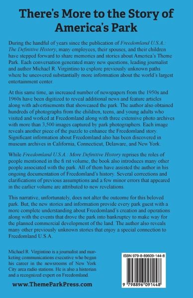 There's More to the Story of America's Park During the handful of years since the publication of Freedomland U.S.A.: The Definitive History, many employees, their spouses, and their children have stepped forward to share memories and stories about America's Theme Park. Each conversation generated many new questions, leading journalist and author Michael R. Virgintino to explore previously unknown paths where he uncovered substantially more information about the world's largest entertainment center. At this same time, an increased number of newspapers from the 1950s and 1960s have been digitized to reveal additional news and feature articles along with advertisements that showcased the park. The author also obtained hundreds of photographs from the children, teens, and young adults who visited and worked at Freedomland along with three extensive photo archives with more than 3,500 images captured by park photographers. Each image reveals another piece of the puzzle to enhance the Freedomland story. Significant information about Freedomland also has been discovered in museum archives in California, Connecticut, Delaware, and New York. While Freedomland U.S.A.: More Definitive History reprises the roles of people mentioned in the first volume, the book also introduces many other people associated with the park. All of them have assisted the author in his ongoing documentation of Freedomland's history. Several corrections and clarifications of previous assumptions and a few minor errors that appeared in the earlier volume are attributed to new revelations. This narrative, unfortunately, does not alter the outcome for this beloved park. But, the new stories and information provide every park guest with a more complete understanding about Freedomland's creation and operations along with the events that drove the park into bankruptcy to make way for the planned commercial development of the land. The author also reveals many other previously unknown stories that enjoy a special connection to Freedomland U.S.A.