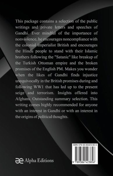 This package contains a selection of the public writings and private letters and speeches of Gandhi. Ever mindful of the importance of nonviolence, he encourages noncompliance with the colonial imperialist British and encourages the Hindu people to stand with their Islamic brothers following the "Satanic" like breakup of the Turkish Ottoman empire and the broken promises of the English PM. Makes you wonder when the likes of Gandhi finds injustice unequivocally in the British promises during and following WW1 that has led up to the present seige and terrorism. Insights offered into Afghans. Outstanding summary selection. This writing comes highly recommended for anyone with an interest in Gandhi or with an interest in the origins of political thoughts.