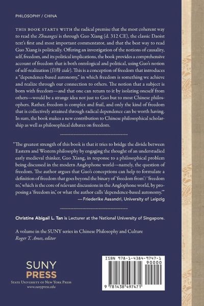 Draws on Guo Xiang's commentary on the Zhuangzi to construct an account of freedom that is both metaphysical and political. This book starts with the radical premise that the most coherent way to read the Zhuangzi is through Guo Xiang (d. 312 CE), the classic Daoist text's first and most important commentator, and that the best way to read Guo Xiang is politically. Offering an investigation of the notions of causality, self, freedom, and its political implications, the book provides a comprehensive account of freedom that is both ontological and political, using Guo's notion of self-realization (¿¿zide). This is a conception of freedom that introduces a "dependence-based autonomy," in which freedom is something we achieve and realize through our connection to others. The notion that a subject is born with freedom-and that one can return to it by isolating oneself from others-would be a strange idea not just to Guo but to most Chinese philosophers. Rather, freedom is complex and frail, and only the kind of freedom that is collectively attained through radical dependence can be worth having. In sum, the book makes a new contribution to Chinese philosophical scholarship as well as philosophical debates on freedom.
