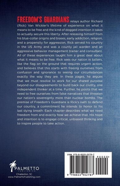 Freedom's Guardians relays author Richard (Rick) Van Wickler's lifetime of experience on what it means to be free and the kind of dogged intention it takes to actually secure this liberty. After releasing himself from his blue-collar origins and biases, early addiction, religion, and a propensity for aggression, Rick served his country in the US Army and was a county jail warden and an aggressive behavior management trainer and consultant. All of these experiences taught him a great deal about what it means to be free. Rick sees our nation in tatters, like the flag on the ground that requires urgent action, and believes that this starts with freeing ourselves from confusion and ignorance to seeing our circumstances exactly the way they are. In these pages, he argues that we must resolve to work for our shared purpose beyond our disagreements to build back our civility, one independent thinker at a time. Further, he posits that we need to free ourselves from false narratives that threaten our nation's sovereignty more than nuclear bombs. The premise of Freedom's Guardians is Rick's oath to defend our country, a commitment he intends to honor to his last dying breath. Each chapter describes what we need freedom from and exactly how we achieve that. His hope and intention is to engage critical, unbiased thinking and to inspire people to take action.