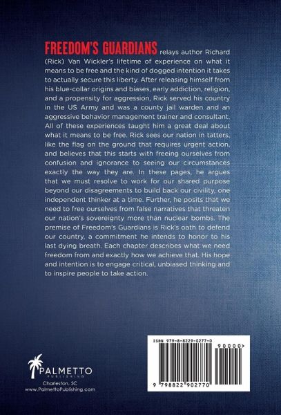 Freedom's Guardians relays author Richard (Rick) Van Wickler's lifetime of experience on what it means to be free and the kind of dogged intention it takes to actually secure this liberty. After releasing himself from his blue-collar origins and biases, early addiction, religion, and a propensity for aggression, Rick served his country in the US Army and was a county jail warden and an aggressive behavior management trainer and consultant. All of these experiences taught him a great deal about what it means to be free. Rick sees our nation in tatters, like the flag on the ground that requires urgent action, and believes that this starts with freeing ourselves from confusion and ignorance to seeing our circumstances exactly the way they are. In these pages, he argues that we must resolve to work for our shared purpose beyond our disagreements to build back our civility, one independent thinker at a time. Further, he posits that we need to free ourselves from false narratives that threaten our nation's sovereignty more than nuclear bombs. The premise of Freedom's Guardians is Rick's oath to defend our country, a commitment he intends to honor to his last dying breath. Each chapter describes what we need freedom from and exactly how we achieve that. His hope and intention is to engage critical, unbiased thinking and to inspire people to take action.