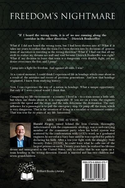 Harald Zieger, raised behind the Iron Curtain, thoroughly indoctrinated with the communistic ideology, was a card-carrying member of the communist party when his belief system was scattered by the confrontation with GOD's word; as a graduated engineer, he served at a Navy base until he was expelled for publicly declaring his faith. After a ten-year fight with the almighty State Security Police (STASI), he could leave what he calls one of the largest prisons on earth. Twenty years later, he realized his lifetime dream and immigrated to the United States, only to realize that he was again on a train heading in the wrong direction. Harald is married and has two children and seven grandchildren.