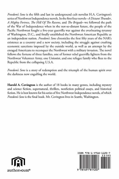 Freedom's Sons is the fifth and last in underground cult novelist H.A. Covington's series of Northwest Independence novels. In the first four novels--A Distant Thunder, A Mighty Fortress, The Hill Of The Ravens, and The Brigade--we followed the path of the War of Independence when in the not-so-distant future, the people of the Pacific Northwest fought a five-year guerrilla war against the overbearing tyranny of Washington, D.C., and finally established the Northwest American Republic as an independent nation. Freedom's Sons chronicles the first fifty years of the NAR's existence as a country and a new society, including the struggle against crushing economic sanctions imposed by the outside world, as well as an attempt by the enraged Americans to reconquer the Northwest with a military invasion. The novel follows the fortune of three families, one of former rebel guerrilla fighters from the Northwest Volunteer Army, one Unionist, and one refugee family who flees to the Republic from the collapsing U.S.A. Freedom's Sons is a story of redemption and the triumph of the human spirit over the darkness now engulfing the world.
