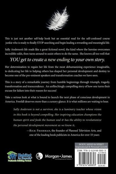 This is just not another self-help book but an essential read for the self-confessed course junkie who is ready to finally STOP searching and begin leading a rewarding and meaningful life. Sally Anderson's life reads like a great fictional novel, the kind where the heroine overcomes incredible odds, then turns around to assist others to do the same. She knows all too well that YOU get to create a new ending to your own story. Her determination to regain her life from the most dehumanizing experience imaginable, to dedicating her life to helping others has shaped her personal development and destiny to become one of the pre-eminent speakers and transformation coaches we have seen. This is a story of a remarkable journey from humble beginnings through triumph, tragedy, transformation and transcendence. A unflinchingly compelling story of how one turns their excuse for failure into their reason for success! Take a serious look at what is bound to launch the next phase of conscious development in America. Freefall deserves more than a cursory glance. It is what millions are waiting to hear "Sally Anderson is not a survivor, she is a luminary teacher whose vision in this book is beyond compelling. Her inspiring education champions the human spirit and feeds the human soul & has the ability to revolutionize the personal development movement as we know it"- Rick Frishman, the founder of Planned Television Arts and one of the leading book publicists in America for over 33 years.