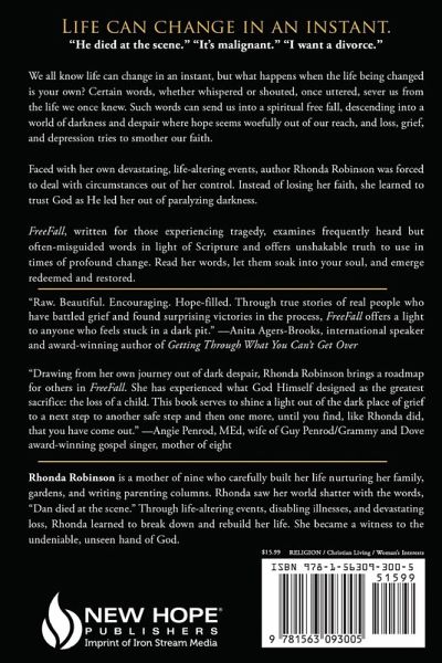 We all know life can change in an instant. But what happens when the life being changed is your own? Faced with her own devastating, life-altering events, author Rhonda Robinson was forced to deal with these questions. Instead of losing her faith, she became a witness to the undeniable, unseen hand of God and now wants to encourage women facing similar struggles to see God do an amazing thing in the midst of the unthinkable. If you or someone you know is faced with grief as a result of difficult circumstances—divorce, cancer, death of a loved one, etc.—then join Rhonda on a journey toward restoration. Unlike other books on grief and loss, FreeFall doesn’t just want you to understand your grief; it seeks to offer you unshakable truth to use in a time of profound change in order to emerge a different, restored person.