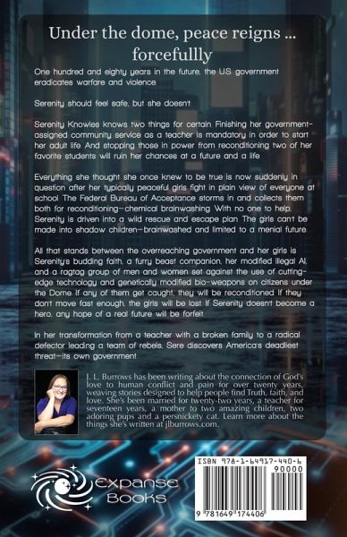 Under the Dome, peace reigns ... forcefully. One hundred and eighty years in the future, the U.S. government eradicates warfare and violence. Serenity should feel safe, but she doesn't. Serenity Knowles knows two things for certain. Finishing her government-assigned community service as a teacher is mandatory in order to start her adult life. And stopping those in power from reconditioning two of her favorite students will ruin her chances at a future and a life. Everything she thought she once knew to be true, suddenly is now in question after her typically peaceful girls fight in plain view of everyone at school. The Federal Bureau of Acceptance storms in and collects them both for reconditioning-chemical brain washing. With no one to help, Serenity is driven into a wild rescue and escape plan. The girls can't be made into shadow children, brainwashed and limited to a menial future. All that stands between the overreaching government and her girls is Serenity's budding faith, a furry beast companion, her modified illegal AI, and a ragtag group of men and women set against the use of cutting-edge technology and genetically modified bio-weapons on citizens under the Dome. If any of them get caught, they will be reconditioned. If they don't move fast enough, the girls will be lost. If she doesn't become a hero, any hope of a real future will be forfeit. In her transformation from a teacher with a broken family to a radical defector leading a team of rebels, Sere discovers America's deadliest threat-its own government.