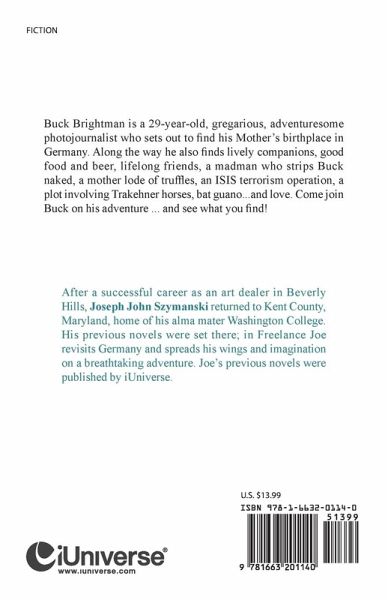 Buck Brightman is a 29-year-old, gregarious, adventuresome photojournalist who sets out to find his Mother's birthplace in Germany. Along the way he also finds lively companions, good food and beer, lifelong friends, a madman who strips Buck naked, a mother lode of truffles, an ISIS terrorism operation, a plot involving Trakehner horses, bat guano...and love. Come join Buck on his adventure ... and see what you find!
