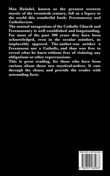 Max Heindel, known as the greatest western mystic of the twentieth century, left as a legacy to the world this wonderful book: Freemansory and Catholiscism. The mutual antagonism of the Catholic Church and Freemasonry is well established and longstanding. For most of the past 300 years they have been acknowledged, even in the secular mindset, as implacably opposed. The author was neither a Freemason nor a Catholic, and thus was free to reveal what he knew without fear of violating any obligations or other repercussions.This is great reading, for those who have been curious about these two mystical-orders. It cuts through the chase; and provide the reader with astounding facts.Chapters include; Lucifer, The Rebel Angel, The Masonic Legend, The Queen Of Sheba, Casting the Molten Sea, The Mystery Of Melchisedec, Spiritual Alchemy, The Philosopher's Stone--What it is and How it is made, The Path Of Initiation, Armageddon, The Great War, and the Coming Age.