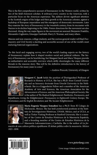 "Eminent scholar Dr. Margaret Jacob has been joined by Dr. María Vázquez Semadeni in writing a significant addition to our understanding of the role that Freemasonry played in the creation of civil society in the 18th century. In today's world, with democracy under attack from so many quarters, and with the growing threat of authoritarianism, this book will help us understand how and why democracy grew out of autocracy in the 18th century. The authors explain how Freemasonry ignited a movement which liberated both men and women to experience for the first time a freedom which reached deep into society. The work is both an accurate history of Freemasonry and its role in the creation of civil society, and a reminder that hard-won liberties can easily be overthrown by those who do not understand the value of a free society and a government that allows that society to flourish." -John L. Cooper III, Ph.D, Past Grand Master, Masonic Grand Lodge of California