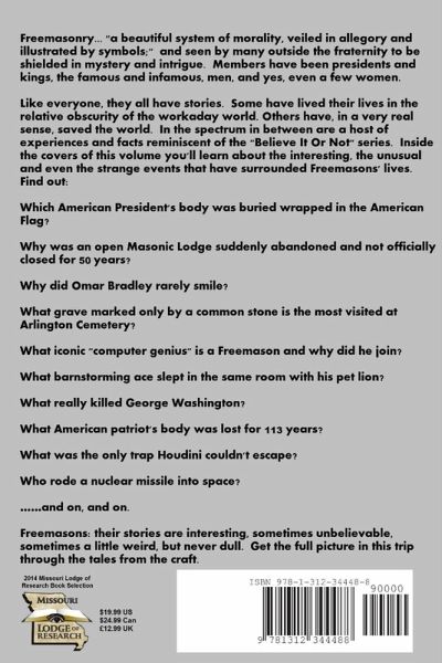 Freemasonry... "a beautiful system of morality, veiled in allegory and illustrated by symbols;" and seen by many outside the fraternity to be shielded in mystery and intrigue. Members have been presidents and kings, the famous and infamous, men, and yes, even a few women. Like everyone, they all have stories. Some have lived their lives in the relative obscurity of the workaday world. Others have, in a very real sense, saved the world. In the spectrum in between are a host of experiences and facts reminiscent of the Believe It Or Not series. Inside the covers of this volume you'll learn about the interesting, the unusual and even the strange events that have surrounded Freemasons' lives. Find out: Freemasons: their stories are interesting, sometimes unbelievable, sometimes a little weird, but never dull. Get the full picture in this trip through the tales from the craft.