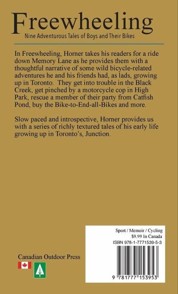 In Freewheeling, Horner takes his readers for a ride down Memory Lane as he provides them with a thoughtful narrative of some wild bicycle-related adventures he and his friends had, as lads, growing up in Toronto. They get into trouble in the Black Creek, get pinched by a motorcycle cop in High Park, rescue a member of their party from Catfish Pond, buy the Bike-to-End-all-Bikes and more. Slow paced and introspective, Horner provides us with a series of richly textured tales of his early life growing up in Toronto's, Junction.