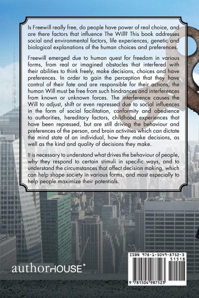 Is Freewill really free, do people have power of real choice, and are there factors that influence The Will? This book addresses social and environmental factors, life experiences, genetic and biological explanations of the human choices and preferences. Freewill emerged due to human quest for freedom in various forms, from real or imagined obstacles that interfered with their abilities to think freely, make decisions, choices and have preferences. In order to gain the perception that they have control of their fate and are responsible for their actions, the human Will must be free from such hindrances and interferences from known or unknown forces. The interference causes the Will to adjust, shift or even repressed due to social influences in the form of social facilitation, conformity and obedience to authorities, hereditary factors, childhood experiences that have been repressed, but are still driving the behaviour and preferences of the person, and brain activities which can dictate the mind state of an individual, how they make decisions, as well as the kind and quality of decisions they make. It is necessary to understand what drives the behaviour of people, why they respond to certain stimuli in specific ways, and to understand the circumstances that affect decision making, which can help shape society in various forms, and most especially to help people maximize their potentials.