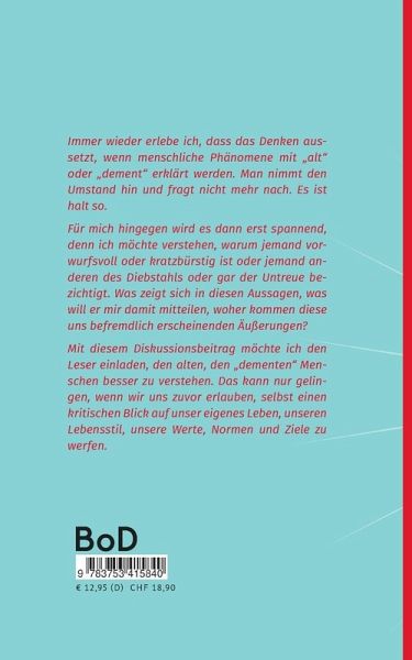 Warum dieses Buch?Wenn ich in Fortbildungen, Kursen, Seminaren oder auch im privaten Umfeld darauf hinweise, dass wir alle gegen Ende unseres Lebens eine Demenz erfahren werden, wenn wir denn nicht vorher versterben, dann reagieren meine Zuhörer fast ausschließlich mit Abwehr, nicht-wahr-haben-wollen, Angst und Erschrecken. Als Beleg, dass ich mit meiner Behauptung falsch liege, wird dann die 101-jährige Oma angeführt, die "noch ganz klar im Kopf ist" - verräterisch in diesem Zusammenhang ist dann das kleine Wörtchen NOCH. Warum löst das Phänomen "Demenz" bei fast allen Menschen in unserem Kulturkreis solche existenziellen Ängste und Befürchtungen aus?Dieser Frage gehe ich in meinem Buch "Frei von Pflichten und Verantwortung - Ein etwas anderer Blick auf das Phänomen Demenz" nach. Dabei kontrastiere ich unsere, wie ich es nenne "Normwelt" mit der "Anderswelt" der Menschen, die eine Demenz erfahren. Hier komme ich zu der Erkenntnis, dass nicht vorrangig die hirnorganischen Veränderungen, sondern vor allem die allgemeinen gesellschaftlichen Anforderungen und Werte unserer leistungsorientierten Gesellschaft, die bei fortschreitender Demenz zusehends infrage gestellt werden, ursächlich sind.Betrachten wir das Phänomen aber unabhängig von unseren gesellschaftlichen Normen und Werten, erkennen wir, dass Menschen, die eine fortschreitende Demenz erfahren, ein gutes Leben führen könnten, wenn Ihre besondere Lebenssituation, ihr Leben im Hier und Jetzt, ihre Gefühle und ihre besonderen Ausdrucksformen respektiert und gewertschätzt werden. Dazu gehört dann auch, dass wir bereits in jüngeren Jahren die Demenz als Lebensperspektive akzeptieren lernen.Es braucht dringend einen anderen, positiveren Blick auf das urmenschliche Phänomen "Demenz".