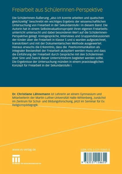Die SchülerInnen-Äußerung "also ich konnte arbeiten und quatschen gleichzeitig" beschreibt ein wichtiges Ergebnis der wissenschaftlichen Untersuchung von Freiarbeit in der Sekundarstufe I in diesem Band. Die Autorin hat in einem Selbstevaluationsprojekt ihren eigenen Freiarbeitsunterricht untersucht und dabei besonderen Wert auf die SchülerInnen-Perspektive gelegt. Kreisgespräche, Interviews und Gruppendiskussionen der Kinder über die Freiarbeit in Klasse 5 und 6 wurden aufgezeichnet, transkribiert und mit der Dokumentarischen Methode ausgewertet. Hieraus erwuchs die Erkenntnis, dass die Peerkommunikation als integraler Bestandteil der Freiarbeit akzeptiert werden muss und dass die Einführung der Freiarbeit durch Gespräche mit den SchülerInnen über Sinn und Zweck dieser Unterrichtsform begleitet werden sollte. Die Ergebnisse der Untersuchung münden in einem praxistauglichen Konzept für Freiarbeit in der Sekundarstufe I.