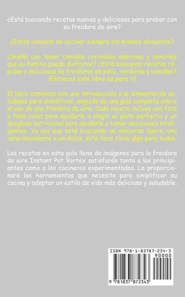 ¿Está buscando recetas nuevas y deliciosas para probar con su freidora de aire? ¿Estás cansado de cocinar siempre los mismos alimentos? ¿Sueña con tener comidas cocinadas sabrosas y sencillas que su familia pueda disfrutar? ¿Está buscando recetas rápidas y deliciosas de freidoras de pollo, verduras y comidas? ¡Entonces este libro es para ti! El libro comienza con una introducción a la alimentación saludable para diabéticos, seguida de una guía completa sobre el uso de una freidora de aire. Cada receta incluye una foto a todo color para ayudarlo a elegir el plato perfecto y un desglose nutricional para ayudarlo a tomar decisiones inteligentes. Ya sea que esté buscando un almuerzo ligero, una cena abundante o un dulce, este libro tiene algo para todos. Las recetas en esta guía llena de imágenes para la freidora de aire Instant Pot Vortex satisfarán tanto a los principiantes como a los cocineros experimentados. Le proporcionará las herramientas que necesita para simplificar su cocina y adoptar un estilo de vida más delicioso y saludable.