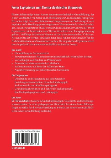 Florian Schütte folgt einem Ansatz naturwissenschaftlicher Grundbildung, der einem Verständnis von Natur und Selbstbildung im Grundschulalter entspricht. Der Autor zeigt, dass es im Rahmen von Lernprozessen von Bedeutung ist, auch implizite, in die Handlungspraxis eingelassene Wissensbestände zu berücksichtigen. In seiner qualitativen Studie werden Grundschulkinder während des freien Explorierens mit Materialien zum Thema Stromkreis und Energiegewinnung gefilmt. Vielfältige Suchräume können mit der dokumentarischen Videoanalyse rekonstruiert werden, innerhalb derer diese Kinder nach Ursachen für das Nichtfunktionieren von Stromkreisen suchen. Die empirischen Ergebnisse setzen neue Impulse für das naturwissenschaftlich-technische Lernen.