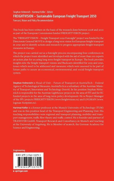 This book has been written on the basis of the research done between 2008 and 2010 as part of the European Commission funded FREIGHTVISION project.The "FREIGHTVISION - Freight Transport 2050 Foresight" project was funded by the Directorate General MOVE to design a long term vision for European freight transport in 2050 and to identify actions and research to progress appropriate freight transport measures in Europe.The project was carried out as a foresight process encompassing four conferences in which the project team identified and developed with the aid of more than 100 experts an action plan for securing long term freight transport in Europe. The book provides insights into the freight transport visions and Backcasts identified for 2035 and 2050, issues which need to be addressed and measures which were assessed to be part of future paths to assure an economical, environmental, and social freight transport system.