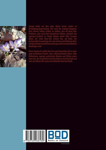 Susann leidet seit über zehn Jahren immer wieder an Erschöpfungsdepressionen. Erst nach der Asperger-Diagnose ihres älteren Sohnes erfährt sie endlich, dass der Kern ihrer Probleme, aber auch ihrer besonderen Stärken, ebenfalls das Asperger-Syndrom ist. Einige Monate später fährt Susanns Mann, der einen Burn-Out erlitten hat, auf Reha. Die hochsensible Susann fragt sich, wie sie diese sechs Wochen allein mit ihren beiden noch kleinen und so gar nicht normalen Kindern bewältigen wird.Dieses Tagebuch erzählt über eine ganz besondere Zeit in einer ganz besonderen Familie, über unkonventionelle Ideen, liebe Helferinnen, asperger-autistisches Denken und Fühlen sowie über Gott, der letztendlich doch die Fäden in der Hand hält und stets ein offenes Ohr sowie eine helfende Hand bereithält.
