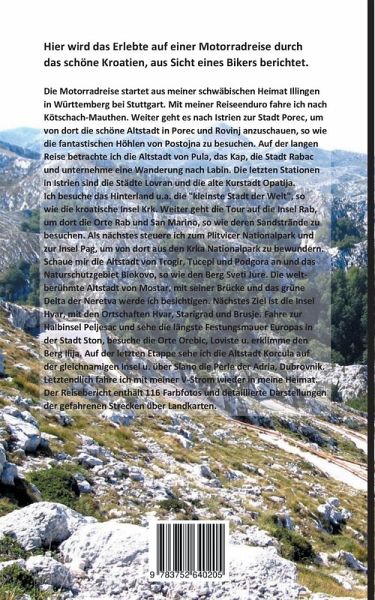 Hier wird das Erlebte auf einer Motorradreise durch das schöne Kroatien, aus Sicht eines Bikers berichtet. Die Motorradreise startet aus meiner schwäbischen Heimat Illingen in Württemberg bei Stuttgart. Mit meiner Reiseenduro fahre ich nach Kötschach-Mauthen. Weiter geht es nach Istrien zur Stadt Porec, um von dort die schöne Altstadt in Porec und Rovinj anzuschauen, so wie die fantastischen Höhlen von Postojna zu besuchen. Auf der langen Reise betrachte ich die Altstadt von Pula, das Kap, die Stadt Rabac und unternehme eine Wanderung nach Labin. Die letzten Stationen in Istrien sind die Städte Lovran und die alte Kurstadt Opatija. Ich besuche das Hinterland u.a. die "kleinste Stadt der Welt", so wie die kroatische Insel Krk. Weiter geht die Tour auf die Insel Rab, um dort die Orte Rab und San Marino, so wie deren Sandstrände zu besuchen. Als nächstes steuere ich zum Plitvicer Nationalpark und zur Insel Pag, um von dort aus den Krka Nationalpark zu bewundern. Schaue mir die Altstadt von Trogir, Tucepi und Podgora an und das Naturschutzgebiet Biokovo, so wie den Berg Sveti Jure. Die weltberühmte Altstadt von Mostar, mit seiner Brücke und das grüne Delta der Neretva werde ich besichtigen. Nächstes Ziel ist die Insel Hvar, mit den Ortschaften Hvar, Starigrad und Brusje. Fahre zur Halbinsel Peljesac und sehe die längste Festungsmauer Europas in der Stadt Ston, besuche die Orte Orebic, Loviste u. erklimme den Berg Ilija. Auf der letzten Etappe sehe ich die Altstadt Korcula auf der gleichnamigen Insel u. über Slano die Perle der Adria, Dubrovnik. Letztendlich fahre ich mit meiner V-Strom wieder in meine Heimat. Der Reisebericht enthält 116 Farbfotos und detaillierte Darstellungen der gefahrenen Strecken über Landkarten.