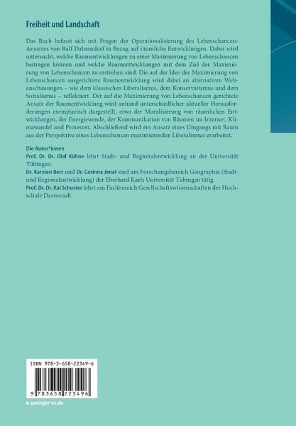 Das Buch befasst sich mit Fragen der Operationalisierung des Lebenschancen-Ansatzes von Ralf Dahrendorf in Bezug auf räumliche Entwicklungen. Dabei wird untersucht, welche Raumentwicklungen zu einer Maximierung von Lebenschancen beitragen können und welche Raumentwicklungen mit dem Ziel der Maximierung von Lebenschancen zu erstreben sind. Die auf der Idee der Maximierung von Lebenschancen ausgerichtete Raumentwicklung wird dabei an alternativen Weltanschauungen - wie dem klassischen Liberalismus, dem Konservatismus und dem Sozialismus - reflektiert. Der auf die Maximierung von Lebenschancen gerichtete Ansatz der Raumentwicklung wird anhand unterschiedlicher aktueller Herausforderungen exemplarisch dargestellt, etwa der Moralisierung von räumlichen Entwicklungen, der Energiewende, der Kommunikation von Räumen im Internet, Klimawandel und Protesten. Abschließend wird ein Ansatz eines Umgangs mit Raum aus der Perspektive eines Lebenschancen maximierenden Liberalismus erarbeitet.