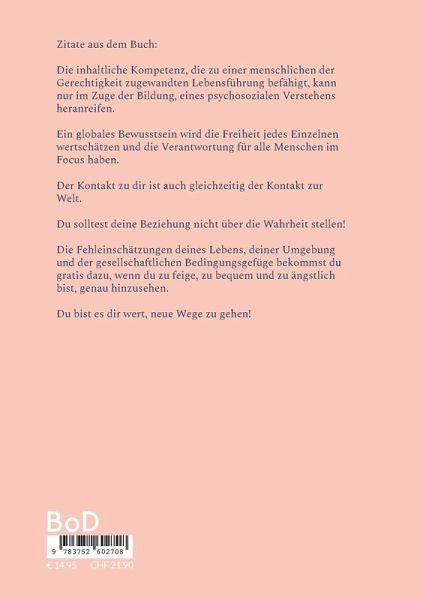 Zitate aus dem Buch:Die inhaltliche Kompetenz, die zu einer menschlichen der Gerechtigkeit zugewandten Lebensführung befähigt, kann nur im Zuge der Bildung, eines psychosozialen Verstehens heranreifen.Ein globales Bewusstsein wird die Freiheit jedes Einzelnen wertschätzen und die Verantwortung für alle Menschen im Focus haben.Der Kontakt zu dir ist auch gleichzeitig der Kontakt zur Welt. Du solltest deine Beziehung nicht über die Wahrheit stellen!Die Fehleinschätzungen deines Lebens, deiner Umgebung und der gesellschaftlichen Bedingungsgefüge bekommst du gratis dazu, wenn du zu feige, zu bequem und zu ängstlich bist, genau hinzusehen.Du bist es dir wert, neue Wege zu gehen!