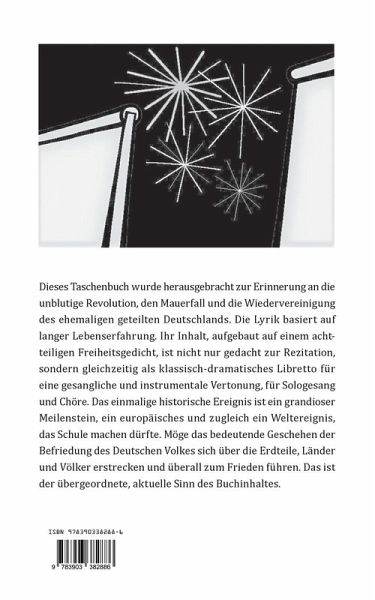 Dieses Taschenbuch wurde herausgebracht zur Erinnerung an die unblutige Revolution, den Mauerfall und die Wiedervereinigung des ehemaligen geteilten Deutschlands. Die Lyrik basiert auf langer Lebenserfahrung. Ihr Inhalt, aufgebaut auf einem achtteiligen Freiheitsgedicht, ist nicht nur gedacht zur Rezitation, sondern gleichzeitig als klassisch-dramatisches Libretto für eine gesangliche und instrumentale Vertonung, für Sologesang und Chöre. Das einmalige historische Ereignis ist ein grandioser Meilenstein, ein europäisches und zugleich ein Weltereignis, das Schule machen dürfte. Möge das bedeutende Geschehen der Befriedung des Deutschen Volkes sich über die Erdteile, Länder und Völker erstrecken und überall zum Frieden führen. Das ist der übergeordnete, aktuelle Sinn des Buchinhaltes.