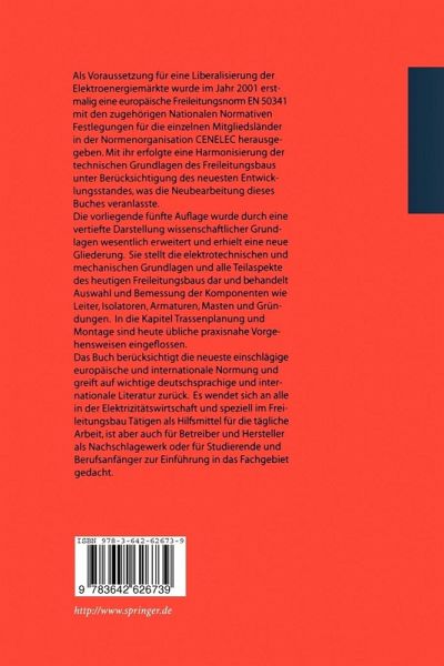 Die Globalisierung des Elektroenergiemarktes führte zur europäischen Norm EN 50341-1 und der daraus abgeleiteten Festlegung für Deutschland EN 50341-3-4. Diese Normen erschienen erst im Jahre 2001. Das Buch stellt die Planung von Freileitungen, die Auswahl der Leiter, die Berechnung und Ausführung der Masten und Gründungen sowie aller anderen Bauteile und die neueren Montagemethoden dar. Es greift auf die aktuellen Ausgaben der einschlägigen nationalen und internationalen Vorschriften zurück und gibt einen Überblick über die wichtige Literatur. Das Werk kann als Nachschlagewerk dienen und als Dokumentation für den derzeitigen technischen Standard des Leitungsbaus. Es wendet sich an Studierende, Berufsanfänger bei Betreibern, Herstellern und Beratungsfirmen, sowie an alle in der Elektrizitätswirtschaft Tätigen.
