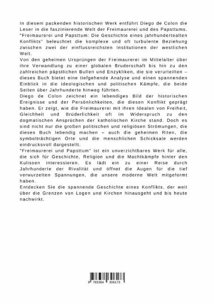In diesem packenden historischen Werk entführt Diego de Colon die Leser in die faszinierende Welt der Freimaurerei und des Papsttums. "Freimaurerei und Papsttum: Die Geschichte eines jahrhundertealten Konflikts" beleuchtet die komplexe und oft turbulente Beziehung zwischen zwei der einflussreichsten Institutionen der westlichen Welt.Von den geheimen Ursprüngen der Freimaurerei im Mittelalter über ihre Verwandlung zu einer globalen Bruderschaft bis hin zu den zahlreichen päpstlichen Bullen und Enzykliken, die sie verurteilten - dieses Buch bietet eine tiefgehende Analyse und einen spannenden…mehr