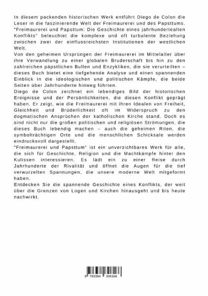 In diesem packenden historischen Werk entführt Diego de Colon die Leser in die faszinierende Welt der Freimaurerei und des Papsttums. "Freimaurerei und Papsttum: Die Geschichte eines jahrhundertealten Konflikts" beleuchtet die komplexe und oft turbulente Beziehung zwischen zwei der einflussreichsten Institutionen der westlichen Welt.Von den geheimen Ursprüngen der Freimaurerei im Mittelalter über ihre Verwandlung zu einer globalen Bruderschaft bis hin zu den zahlreichen päpstlichen Bullen und Enzykliken, die sie verurteilten - dieses Buch bietet eine tiefgehende Analyse und einen spannenden Einblick in die ideologischen und politischen Kämpfe, die beide Seiten über Jahrhunderte hinweg führten.Diego de Colon zeichnet ein lebendiges Bild der historischen Ereignisse und der Persönlichkeiten, die diesen Konflikt geprägt haben. Er zeigt, wie die Freimaurerei mit ihren Idealen von Freiheit, Gleichheit und Brüderlichkeit oft im Widerspruch zu den dogmatischen Ansprüchen der katholischenKirche stand. Doch es sind nicht nur die großen politischen und religiösen Strömungen, die dieses Buch lebendig machen - auch die geheimen Riten, die symbolträchtigen Orte und die menschlichen Schicksale werden eindrucksvoll dargestellt."Freimaurerei und Papsttum" ist ein unverzichtbares Werk für alle, die sich für Geschichte, Religion und die Machtkämpfe hinter den Kulissen interessieren. Es lädt ein zu einer Reise durch Jahrhunderte der Rivalität und öffnet die Augen für die tief verwurzelten Spannungen, die unsere moderne Welt mitgeformt haben.Entdecken Sie die spannende Geschichte eines Konflikts, der weit über die Grenzen von Logen und Kirchen hinausgeht und bis heute nachwirkt.