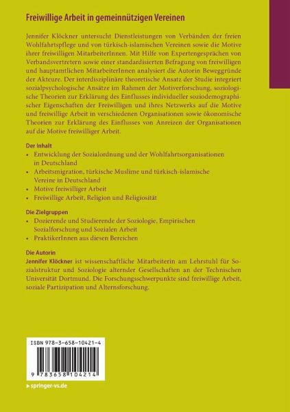 Jennifer Klöckner untersucht Dienstleistungen von Verbänden der freien Wohlfahrtspflege und von türkisch-islamischen Vereinen sowie die Motive ihrer freiwilligen MitarbeiterInnen. Mit Hilfe von Expertengesprächen von Verbandsvertretern sowie einer standardisierten Befragung von freiwilligen und hauptamtlichen MitarbeiterInnen analysiert die Autorin Beweggründe der Akteure. Der interdisziplinäre theoretische Ansatz der Studie integriert sozialpsychologische Ansätze im Rahmen der Motiverforschung, soziologische Theorien zur Erklärung des Einflusses individueller soziodemographischer Eigenschaften der Freiwilligen und ihres Netzwerks auf die Motive und freiwillige Arbeit in verschiedenen Organisationen sowie ökonomische Theorien zur Erklärung des Einflusses von Anreizen der Organisationen auf die Motive freiwilliger Arbeit.