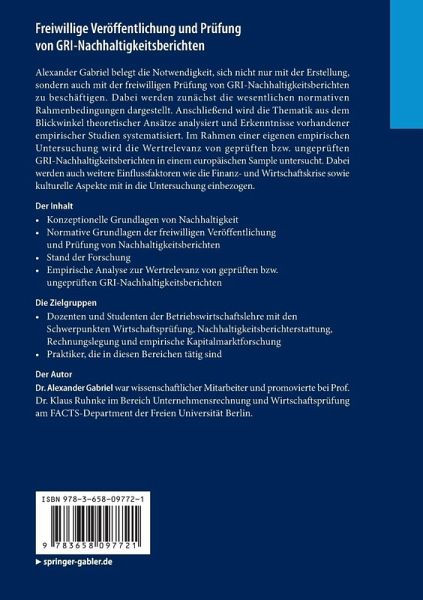 Alexander Gabriel belegt die Notwendigkeit, sich nicht nur mit der Erstellung, sondern auch mit der freiwilligen Prüfung von GRI-Nachhaltigkeitsberichten zu beschäftigen. Dabei werden zunächst die wesentlichen normativen Rahmenbedingungen dargestellt. Anschließend wird die Thematik aus dem Blickwinkel theoretischer Ansätze analysiert und Erkenntnisse vorhandener empirischer Studien systematisiert. Im Rahmen einer eigenen empirischen Untersuchung wird die Wertrelevanz von geprüften bzw. ungeprüften GRI-Nachhaltigkeitsberichten in einem europäischen Sample untersucht. Dabei werden auch weitere Einflussfaktoren wie die Finanz- und Wirtschaftskrise sowie kulturelle Aspekte mit in die Untersuchung einbezogen.