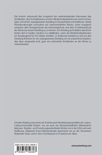 Die Autorin untersucht den Ausgleich der widerstreitenden Interessen des Emittenten, des Großaktionärs und der Minderheitsaktionäre bei einem freiwilligen und einem zwangsweisen Delisting in Deutschland und Südkorea. Beide Rechtsordnungen versuchen auf unterschiedliche Weise, einen Ausgleich zwischen dem Anlegerschutz als Individualschutz und dem Funktionsschutz der Börse bei einem Delisting zu erreichen. Ein Delisting auf Initiative des Emittenten darf in beiden Landern nur stattfinden, wenn die Minderheitsaktionare ein Kaufangebot für ihre Aktien erhalten. In Südkorea handelt es sich bei den Delisting-Kriterien für ein zwangsweises Delisting um ein präventives System, das dazu eingesetzt wird, gute von schlechten Emittenten an der Börse zu unterscheiden.