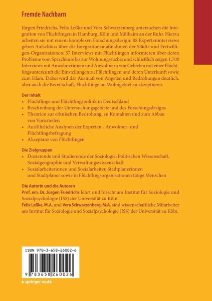 Jürgen Friedrichs, Felix Leßke und Vera Schwarzenberg untersuchen die Integration von Flüchtlingen in Hamburg, Köln und Mülheim an der Ruhr. Hierzu arbeiten sie mit einem komplexen Forschungsdesign: 88 Experteninterviews geben Aufschluss über die Integrationsmaßnahmen der Städte und Freiwilligen-Organisationen; 57 Interviews mit Flüchtlingen informieren über deren Probleme vom Sprachkurs bis zur Wohnungssuche; und schließlich zeigen 1.700 Interviews mit Anwohnerinnen und Anwohnern von Gebieten mit einer Flüchtlingsunterkunft die Einstellungen zu Flüchtlingen und deren Unterkunft sowie zum Islam. Dabei wird das Ausmaß von Ängsten und Bedrohungen deutlich, aber auch die Bereitschaft, Flüchtlinge im Wohngebiet zu akzeptieren.