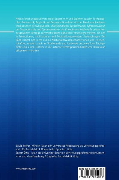 Neben Forschungsdesiderata dreier Expertinnen und Experten aus den Fachdidaktiken Romanistik, Anglistik und Germanistik widmet sich der Band verschiedenen thematischen Schwerpunkten: (Früh)kindlicher Spracherwerb, Spracherwerb in der Sekundarstufe und Spracherwerb in der Erwachsenenbildung. Er präsentiert ausgewählte Beiträge zu verschiedenen aktuellen Forschungsansätzen, die sich in Promotions-, Habilitations- und Publikationsprojekten niederschlagen. Der Band richtet sich nicht nur an Nachwuchswissenschaftlerinnen und -wissenschaftler, sondern auch an Studierende und Lehrende des jeweiligen Fachgebietes, die einen Einblick in die aktuelle fremdsprachendidaktische Diskussion bekommen möchten.