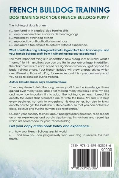 French Bulldog Training - Dog Training for your French Bulldog puppy The training of dogs is often... ... confused with classical dog training drills ... only considered necessary for demanding dogs ... mocked by other dog owners ... replaced by anti-authoritarian methods ... considered too difficult to achieve without experience. What constitutes dog training and what is it good for? And how can you and your French Bulldog profit from it without having any experience? The most important thing is to understand how a dog sees his world, what is "normal" for him and how you can use this to your advantage. In addition, the characteristics of each breed are significant when you get beyond the basic training phase. Your French Bulldog will show characteristics which are different to those of a Husky, for example, and this is predominantly what you need to consider during training. This book is vol. 1 of the French Bulldog training books. Vol. 2 for your grown up French Bulldog is also available with the title "French Bulldog Training Vol. 2: Dog Training for your grown-up French Bulldog" Author Claudia Kaiser says about her book: "It was my desire to let other dog owners profit from the knowledge I have gained over many years, and after making many mistakes. I love my dog and know how important it is to adapt the training to suit each breed. It is exactly this desire that prompted me to write this book. My aim is to help every beginner, not only to understand his dog better, but also to know exactly how to get the best results, step-by-step, so that you can achieve a close, positive and trusting human-dog relationship." Quench your curiosity to know about background information, read reports on other experiences and obtain step-by-step instructions and secret tips which are tailor-made for your French Bulldog. Get your copy of this book today and experience... ... how your French Bulldog sees his world ... and how you can progressively train your dog to receive the best results. Your French Bulldog will appreciate it... ... so this is my advice: Don't hesitate to buy this book! Content of this book: About the Author Preface What you need to know about your French Bulldog Cornerstones of training puppies Before the puppy arrives The first few weeks The first commands Training basic knowledge Check list for the start Conclusion