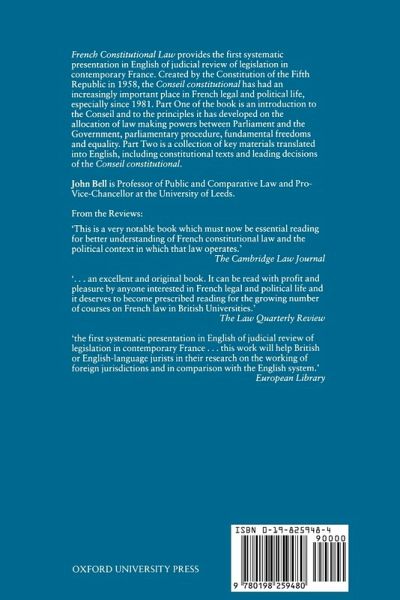 French Constitutional Law provides the first systematic presentation in English of judicial review of legislation in contemporary France. Created by the Constitution of the Fifth Republic in 1958, the Conseil Constitutionnel has had an increasingly important place in French legal and political life, especially since 1981. Part One of the book is an introduction to the Conseil and to the principles it has developed on the allocation of law-making powers between Parliament and the Government, parliamentary procedure, fundamental freedoms, and equality. Part Two is a collection of key materials translated into English, including constitutional texts and leading decisions of the Conseil Constitutionnel.