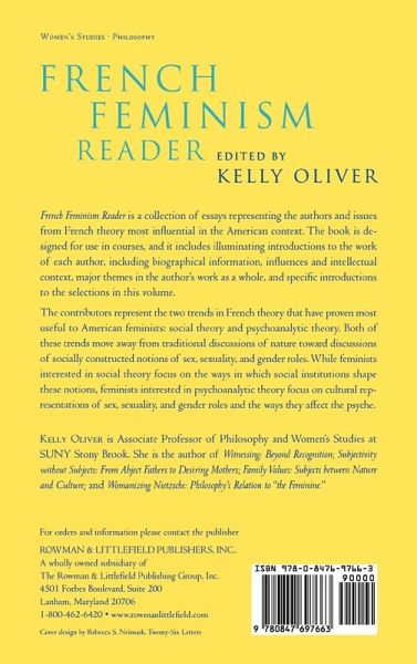 French Feminism Reader is a collection of essays representing the authors and issues from French theory most influential in the American context. The book is designed for use in courses, and it includes illuminating introductions to the work of each author. These introductions include biographical information, influences and intellectual context, major themes in the author's work as a whole, and specific introductions to the selections in this volume. The contributors represent the two trends in French theory that have proven most useful to American feminists: social theory and psychoanalytic theory. Both of these trends move away from any traditional discussions of nature toward discussions of socially constructed notions of sex, sexuality and gender roles. While feminists interested in social theory focus on the ways in which social institutions shape these notions, feminists interested in psychoanalytic theory focus on cultural representations of sex, sexuality and gender roles, and the ways that they affect the psyche. This collection includes selections by Simone de Beauvoir, Christine Delphy, Colette Guilluamin, Monique Wittig, Michele Le Doeuff, Julia Kristeva, Luce Irigaray, and Helene Cixous.