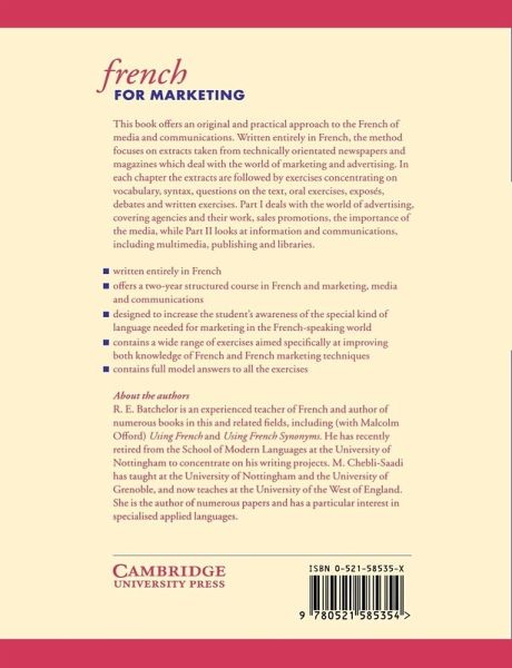 Written entirely in French, this book provides a structured two-year course in French and marketing, media and comunications. It contains a wide range of exercises, with model answers, aimed at improving both knowledge of French and French marketing techniques.