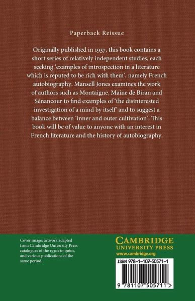 Originally published in 1937, this book contains a short series of relatively independent studies, each seeking 'examples of introspection in a literature which is reputed to be rich with them', namely French autobiography. Mansell Jones examines the work of authors such as Montaigne, Maine de Biran and Sénancour to find examples of 'the disinterested investigation of a mind by itself' and to suggest a balance between 'inner and outer cultivation'. This book will be of value to anyone with an interest in French literature and the history of autobiography.