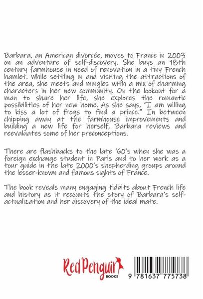 Barbara, an American divorcée, moves to France in 2003 on an adventure of self-discovery. She buys an 18th century farmhouse in need of renovation in a tiny French hamlet. While settling in and visiting the attractions of the area, she meets and mingles with a mix of charming characters in her new community. On the lookout for a man to share her life, she explores the romantic possibilities of her new home. As she says, "I am willing to kiss a lot of frogs to find a prince." In between chipping away at the farmhouse improvements and building a new life for herself, Barbara reviews and reevaluates some of her preconceptions. There are flashbacks to the late '60's when she was a foreign exchange student in Paris and to her work as a tour guide in the late 2000's shepherding groups around the lesser-known and famous sights of France. The book reveals many engaging tidbits about French life and history as it recounts the story of Barbara's self-actualization and her discovery of the ideal mate.