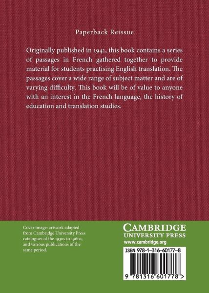 Originally published in 1941, this book contains a series of passages in French gathered together to provide material for students practising English translation. The passages cover a wide range of subject matter and are of varying difficulty. This book will be of value to anyone with an interest in the French language, the history of education and translation studies.