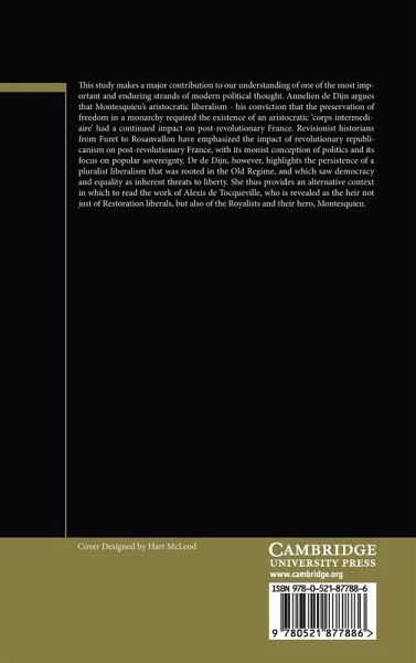 This study makes a major contribution to our understanding of one of the most important and enduring strands of modern political thought. Annelien de Dijn argues that Montesquieu's aristocratic liberalism - his conviction that the preservation of freedom in a monarchy required the existence of an aristocratic 'corps intermédiaire' - had a continued impact on post-revolutionary France. Revisionist historians from Furet to Rosanvallon have emphasised the impact of revolutionary republicanism on post-revolutionary France, with its monist conception of politics and its focus on popular sovereignty. Dr de Dijn, however, highlights the persistence of a pluralist liberalism that was rooted in the Old Regime, and which saw democracy and equality as inherent threats to liberty. She thus provides an alternative context in which to read the work of Alexis de Tocqueville, who is revealed as the heir not just of Restoration liberals, but also of the Royalists and their hero, Montesquieu.