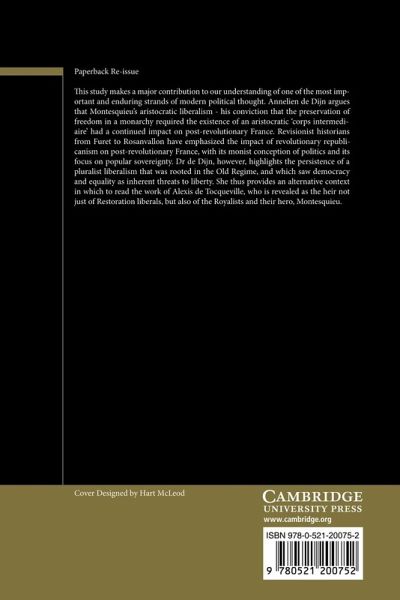 This study makes a major contribution to our understanding of one of the most important and enduring strands of modern political thought. Annelien de Dijn argues that Montesquieu's aristocratic liberalism - his conviction that the preservation of freedom in a monarchy required the existence of an aristocratic 'corps intermédiaire' - had a continued impact on post-revolutionary France. Revisionist historians from Furet to Rosanvallon have emphasised the impact of revolutionary republicanism on post-revolutionary France, with its monist conception of politics and its focus on popular sovereignty. Dr de Dijn, however, highlights the persistence of a pluralist liberalism that was rooted in the Old Regime, and which saw democracy and equality as inherent threats to liberty. She thus provides an alternative context in which to read the work of Alexis de Tocqueville, who is revealed as the heir not just of Restoration liberals, but also of the Royalists and their hero, Montesquieu.