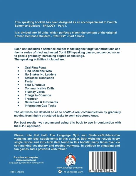 This speaking booklet has been designed as an accompaniment to French Sentence Builders - TRILOGY - Part 1. It is divided into 15 units, which perfectly match the content of the original French Sentence Builders - TRILOGY - Part 1 book. Each unit includes a sentence builder modelling the target constructions and then a series of tried and tested Conti EPI speaking games, sequenced so as to pose a gradually increasing degree of challenge. The speaking activities included are: Oral Ping Pong Find Someone Who No Snakes No Ladders Staircase Translation Faster! Fast & Furious Communicative Drills Fluency Cards Things in Common Trapdoor Detectives & Informants Information Gap Tasks The activities are devised so as to scaffold oral communication by gradually moving from highly structured tasks to semi-structured ones. For best results, we recommend using this book to use in conjunction with the E.P.I. approach.