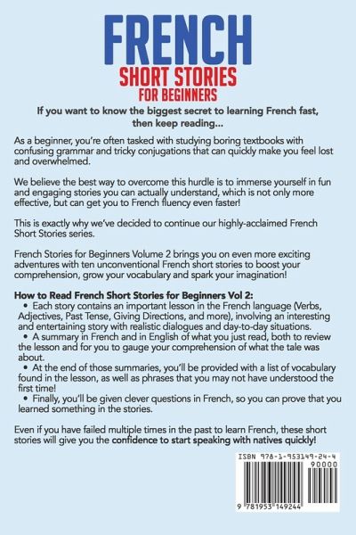 If you want to know the biggest secret to learning French fast, then keep reading... As a beginner, in fact, studying with boring textbooks with confusing grammar and conjugations can make you feel lost and even more overwhelmed than when you began. We believe one of the biggest secrets is to immerse yourself in fun and engaging stories you can actually understand, which is not only more effective, but can get you to French fluency even faster. This is exactly what inspired us to continue our series of French Short Stories. Enter French Stories for Beginners Vol 2:You will find 10 easy-to-read, engaging, and fun stories that will not only help you to dramatically expand your vocabulary but it gives you the tools to improve your grasp of the French language. Boost your comprehension, grow your vocabulary and spark your imagination with these ten unconventional French short stories! All stories are written with beginner French learners in mind using vocabulary that you could easily use in your day-to-day conversations. With that said, it is highly recommended to have a basic understanding of French to achieve maximum enjoyment and effectiveness of the lessons. This program is excellent for those who want to get an introduction to the language or brush up on their French language skills. How to Read French Short Stories for Beginners Vol 2:Each story contains an important lesson in the French language (Verbs, Adjectives, Past Tense, Giving Directions, and more), involving an interesting and entertaining story with realistic dialogues and day-to-day situations. A summary in French and in English of what you just read, both to review the lesson and for you to gauge your comprehension of what the tale was about. At the end of those summaries, you'll be provided with a list of vocabulary found in the lesson, as well as phrases that you may not have understood the first time! Finally, you'll be given clever questions in French, so you can prove that you learned something in the stories. Even if you have failed multiple times in the past to learn French, these short stories will give you the confidence and boost you need to finally grasp the language! So scroll back up, click "Add to Cart" and get your copy of French Short Stories for Beginners Volume 2 today!